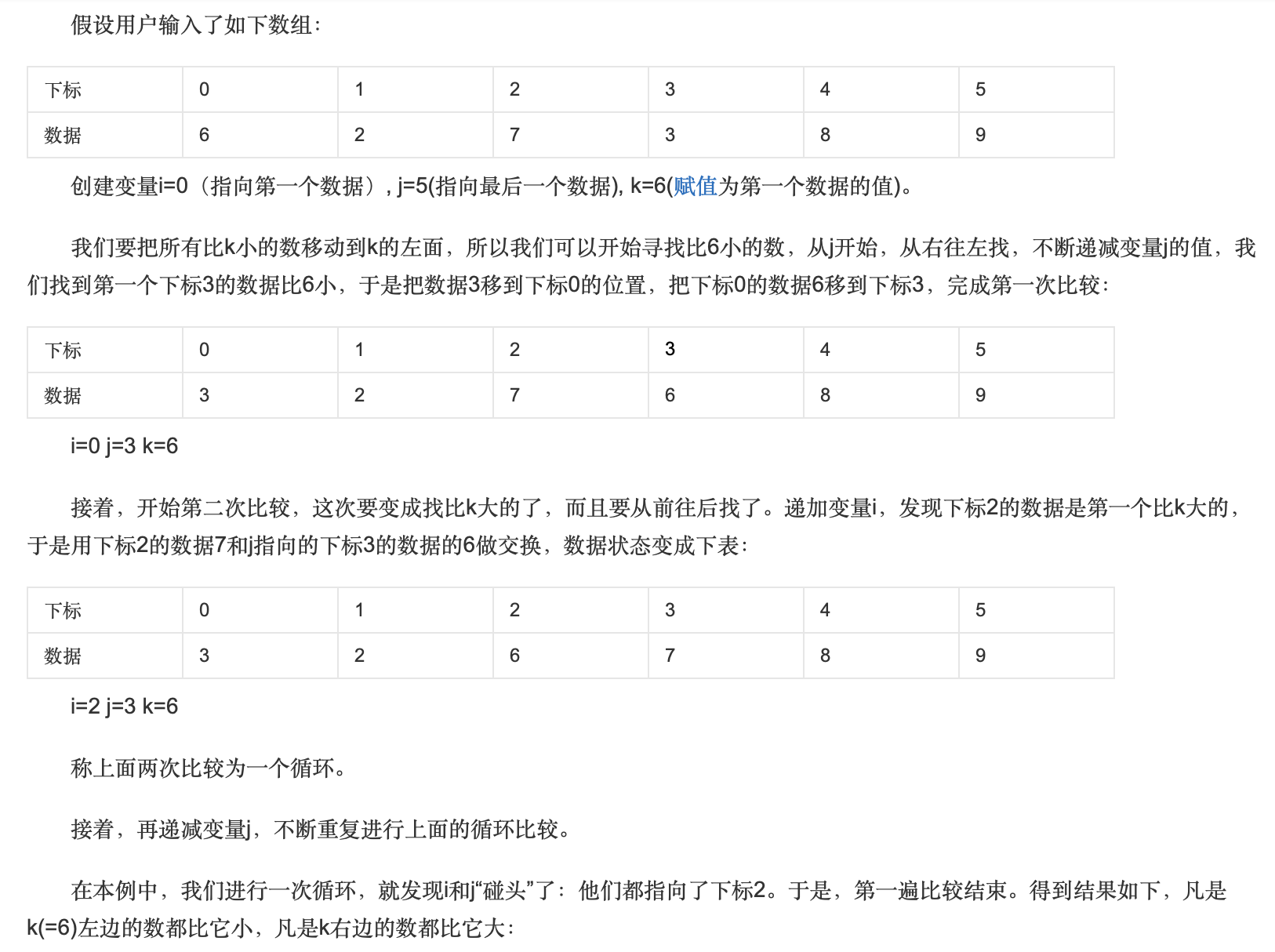 换个思路的话,这道题其实就是排序,我想到的是快排,是排序中的基础方法,顺便就练习一下。把数组中的第一个元素作为哨,我们知道一趟快排结束之后,哨将找到它最终排序所在的位置,再递归的对哨左边和右边进行快排即可。简单介绍一下快排,图片来自百度百科: