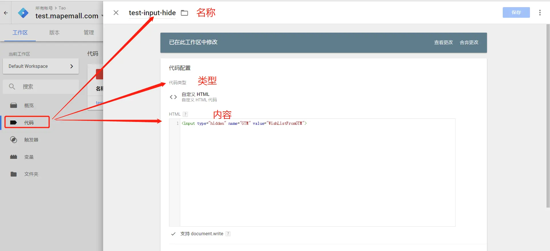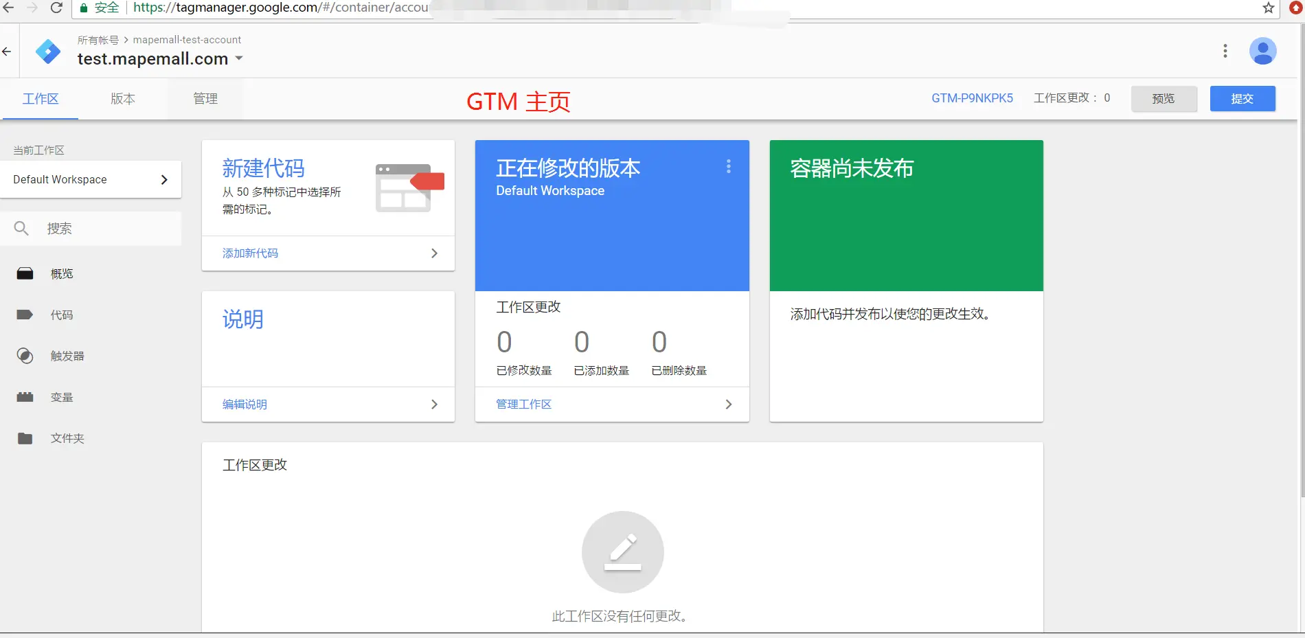 下面从创建GTM容器到页面触发嵌入指定代码片段为例,演示GTM的基本使用。