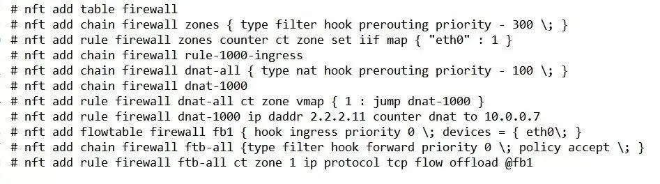 **问题描述:**Firewall创建规则从eth0收到目的地址2.2.2.11的报文,DNAT为10.0.0.7, flow offload无法工作。