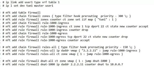 **问题定位:**研究发现网卡加入VRF后收到的报文会两次进入PREROUTING hook,因为在进入IP stack时会进第一次PREROUTING hook,然后被VRF设备接管后会再次进入PREROUTING hook。上述规则第一次在rule-1000-ingress chain中dst nat为10.0.0.7,第二次由于报文被DNAT后会错误的进入rule-1000-egress,导致报文被丢弃。