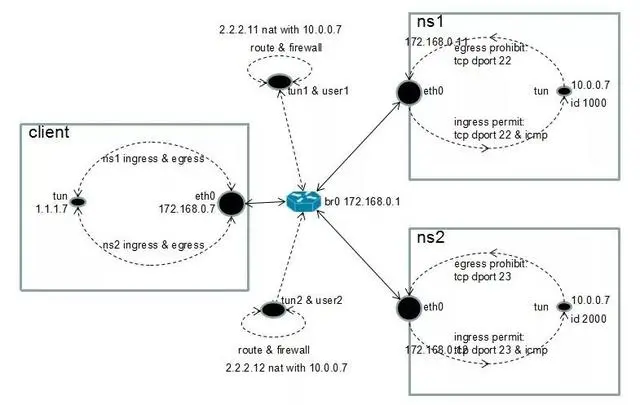 最终,client可以通过2.2.2.11成功访问user1 tcp 22端口服务,user1不能访问client tcp 22端口服务;client可以通过2.2.2.12成功访问user2 tcp 23端口服务,user1不能访问client tcp 23端口服务。