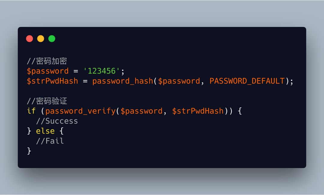password_hash() 使用足够强度的单向散列算法创建密码的哈希(hash)。