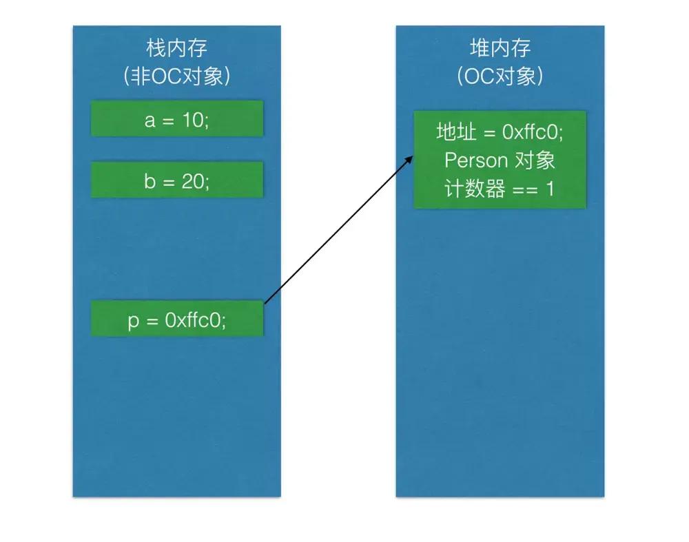 Person *p = [[Person alloc] init]; // 执行完引用计数为1
