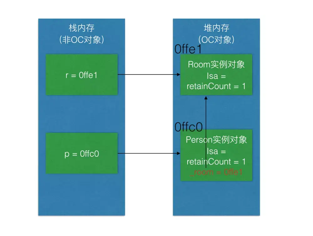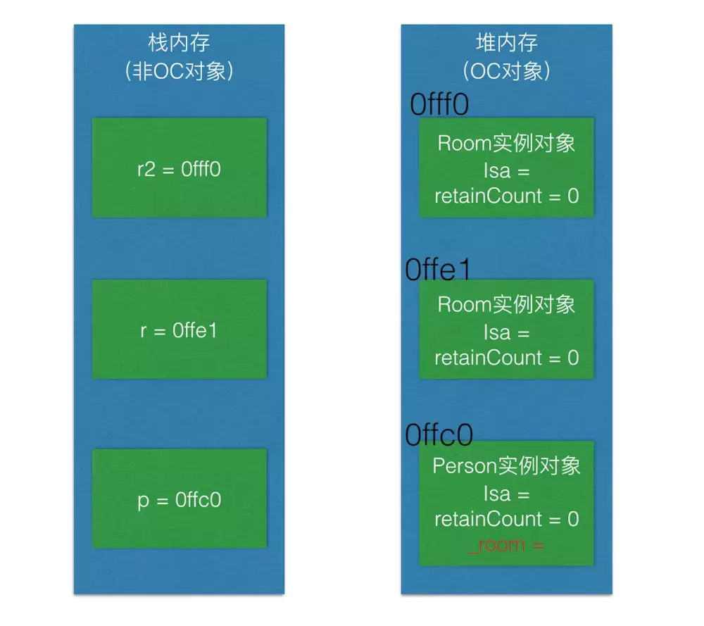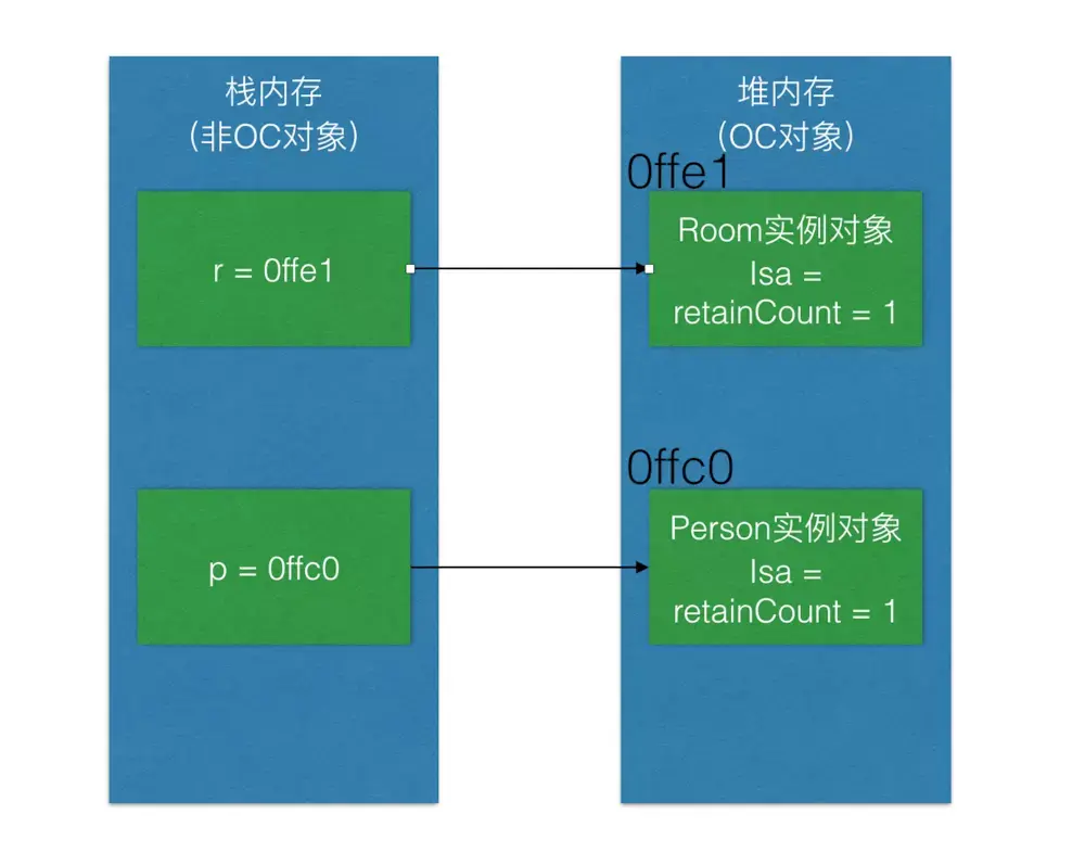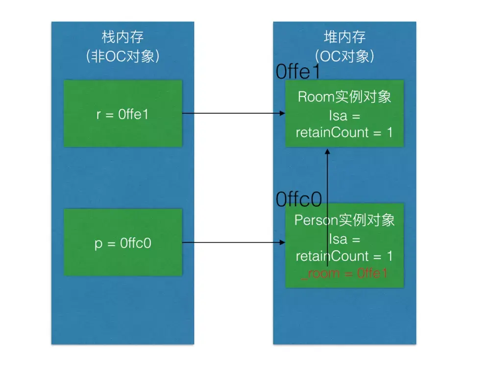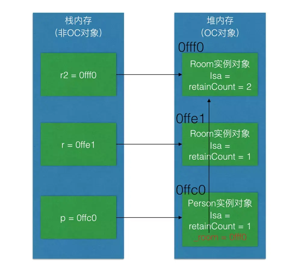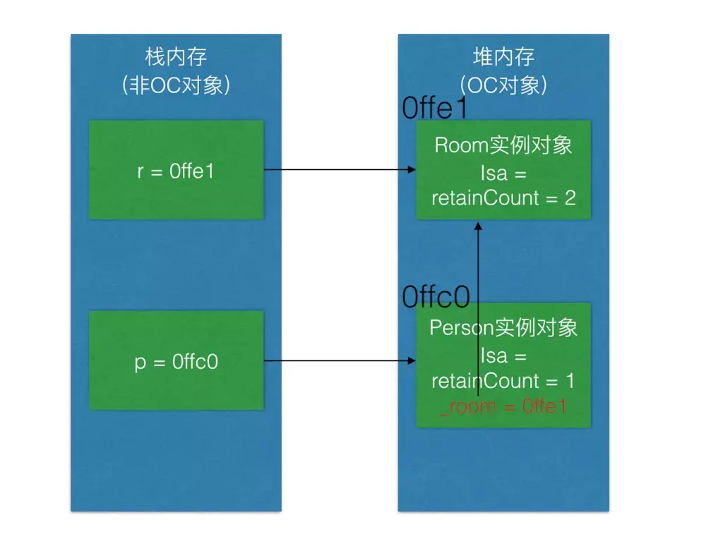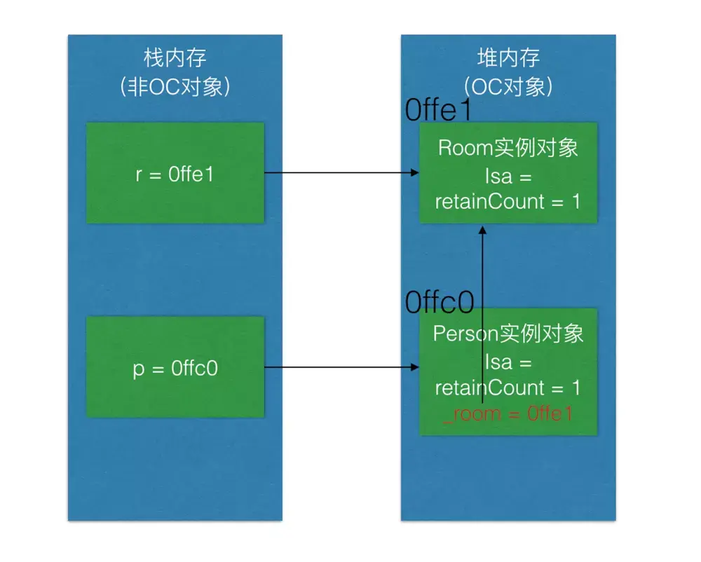 继续执行第5行代码[r release];,释放房间,Room实例对象引用计数-1,在内存中的表现如下图所示: