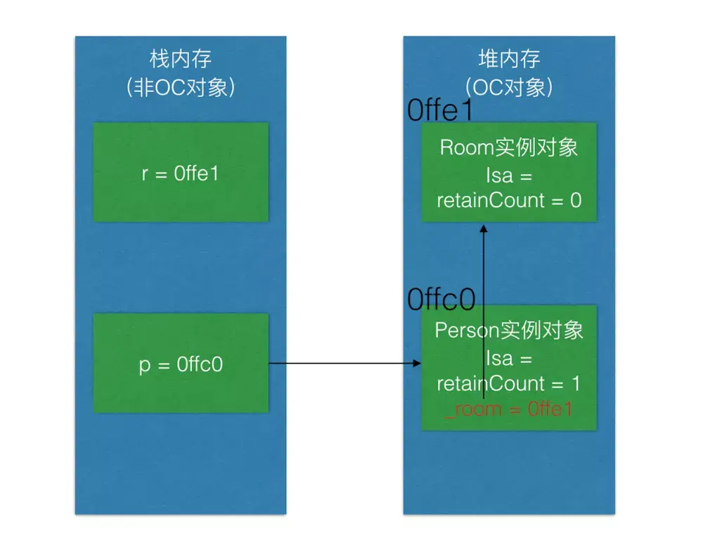 然后再执行p.room = r;,因为setter方法会将之前的Room实例对象先release掉,此时内存表现为: