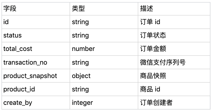 1) 创建订单:Order 表中创建一条新记录,status 字段默认值为 "no_paid",保存订单金额,商品快照和商品 id 以及订单创建者,其中订单创建者由 BaaS 的用户系统自动处理,值为创建订单的用户 id: