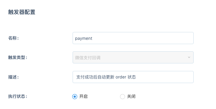 我们希望当支付完成之后,触发器可以帮我们自动地操作数据库,更新订单对应的 status 和 transaction_no 字段。触发器设置如下: