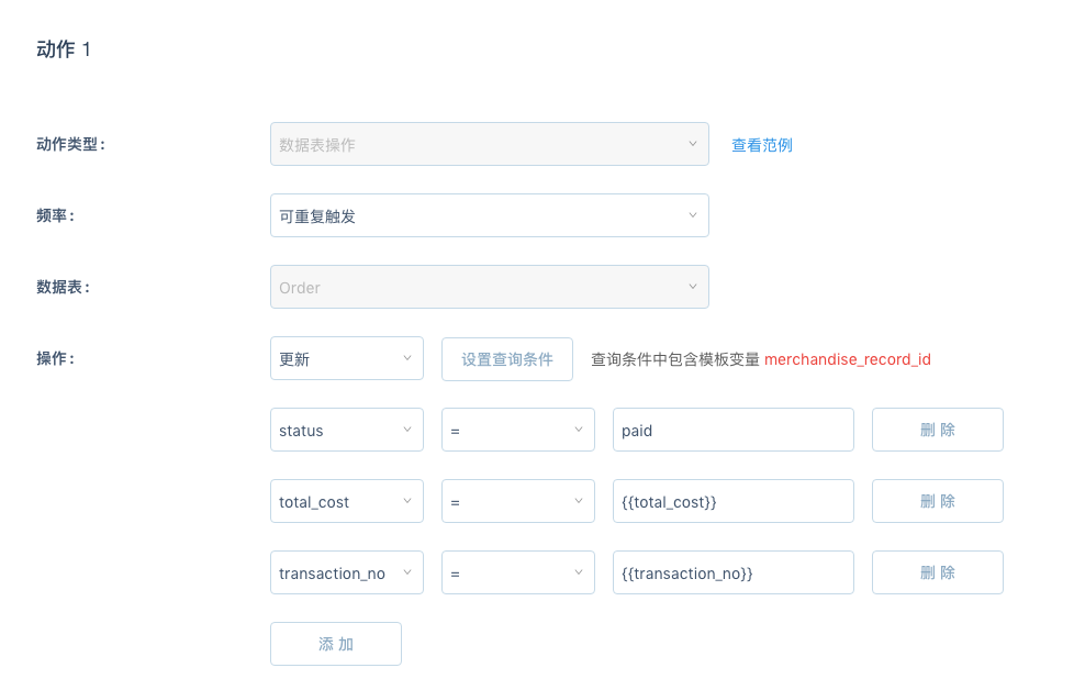 「动作」定义了触发器将要执行的操作,这里是更新 Order 数据表对应的 status、total_cost 和 transaction_no 字段。更多触发器的具体细节,不同平台的实现有所不同,在此不展开讨论。