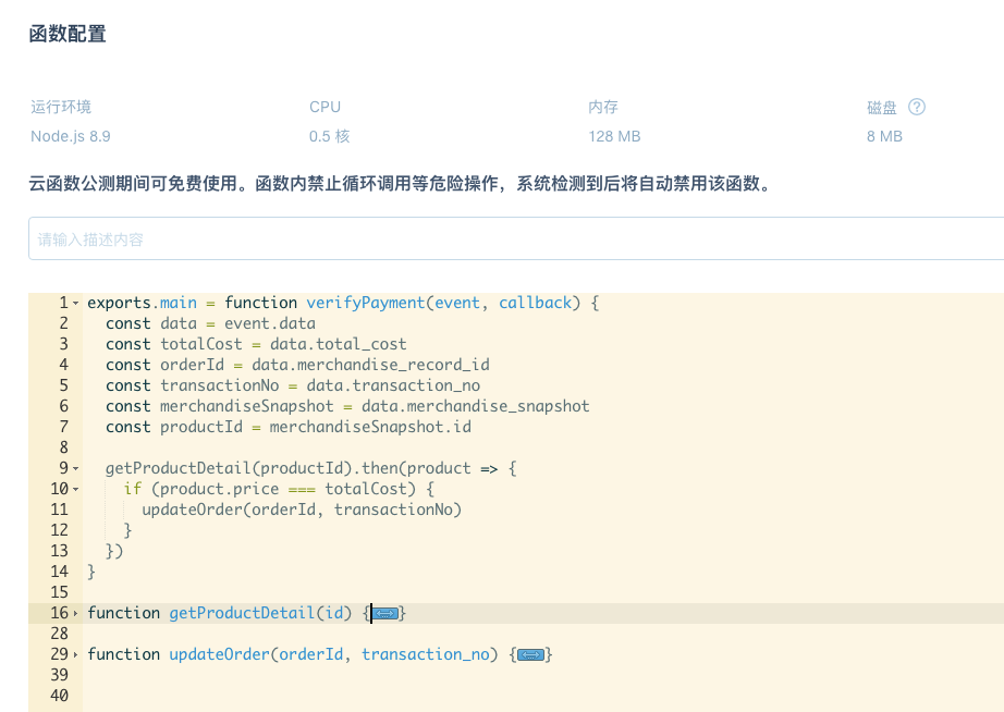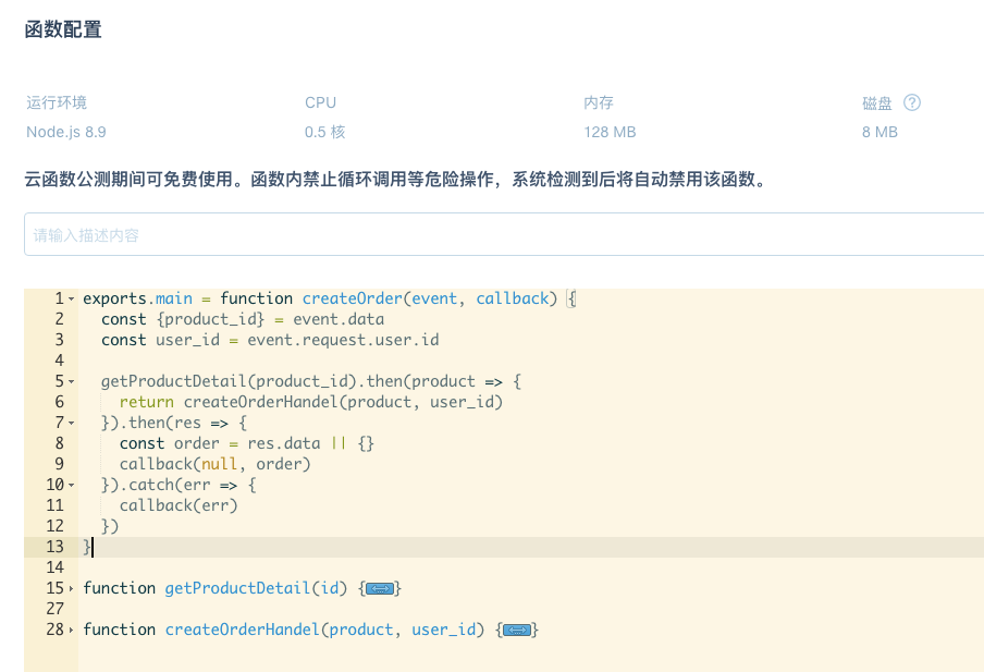 为了避免创建订单时客户端数据篡改或商品信息不能实时同步的问题,我们将创建订单的逻辑迁移到 BaaS 平台的云函数中: