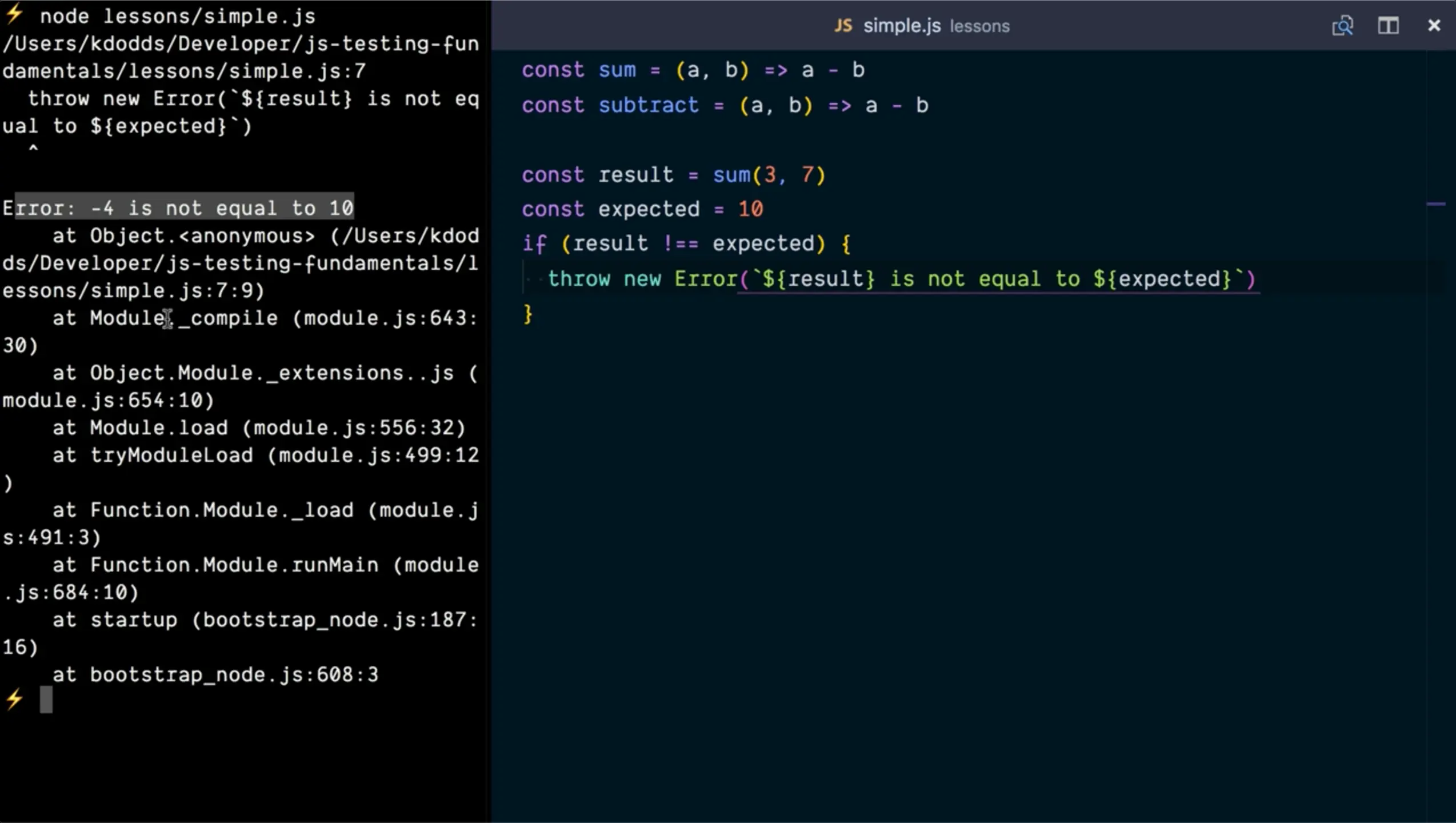 In this lesson, we’ll get the most fundamental understanding of what an automated test is in JavaScript. A test is code that throws an error when the actual result of something does not match the expected output.