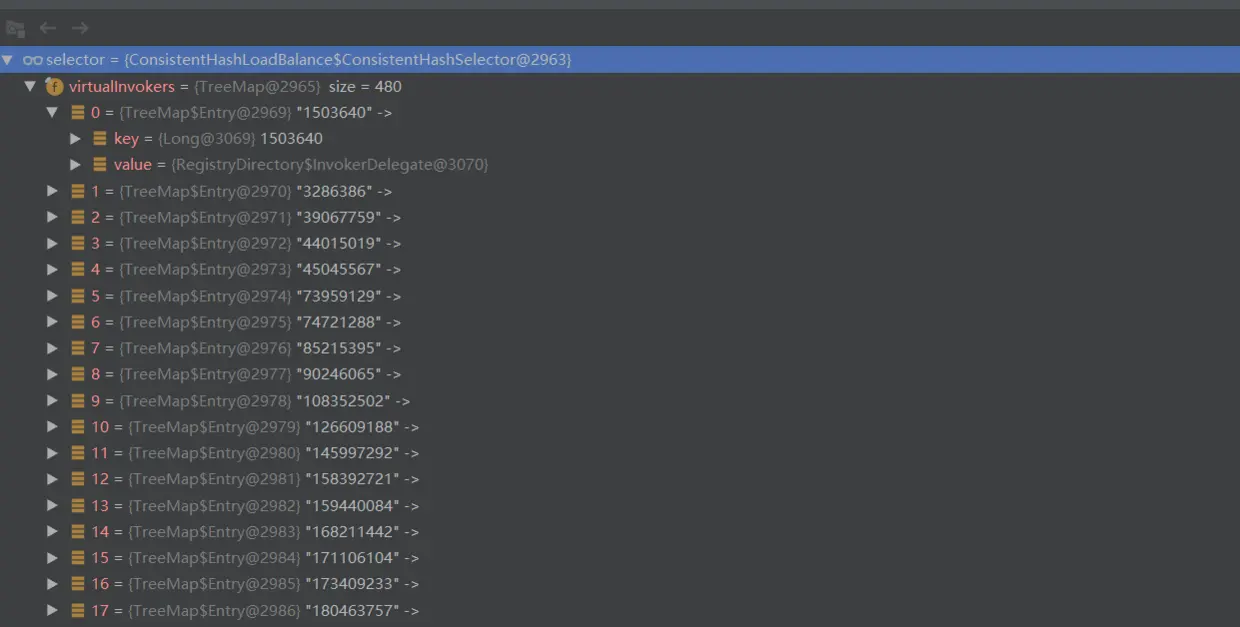 计算出Hash值之后,事情就变得简单了。按照一致性Hash算法中的原理来说就是在Hash环上顺时针查找距离这个Key值的Hash值最近的服务器节点 。落实到Dubbo上来说,就是在virtualInvokers这个TreeMap中,返回其键大于或等于Hash值的部分数据,然后取第一个。