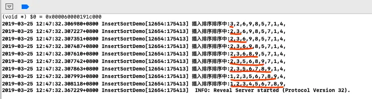 NSLog(@"插入排序排序中:%@",[self getArrayStr:array]);