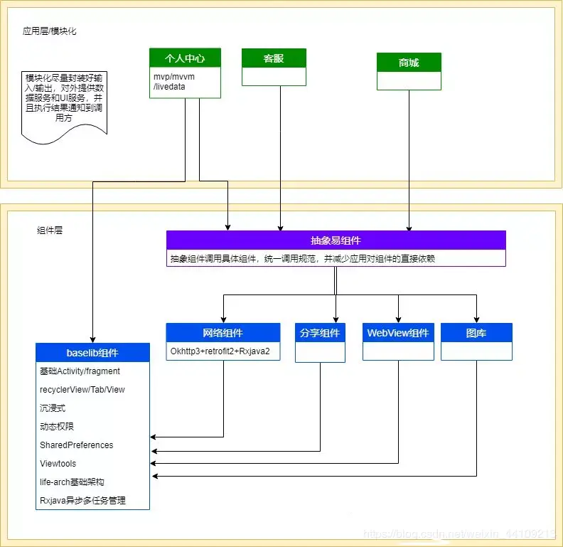 架构主要是业务模块化,以及通用功能组件化。但不限于此,有需要还能继续分拆,业务模块组件化,插件化,或进程化