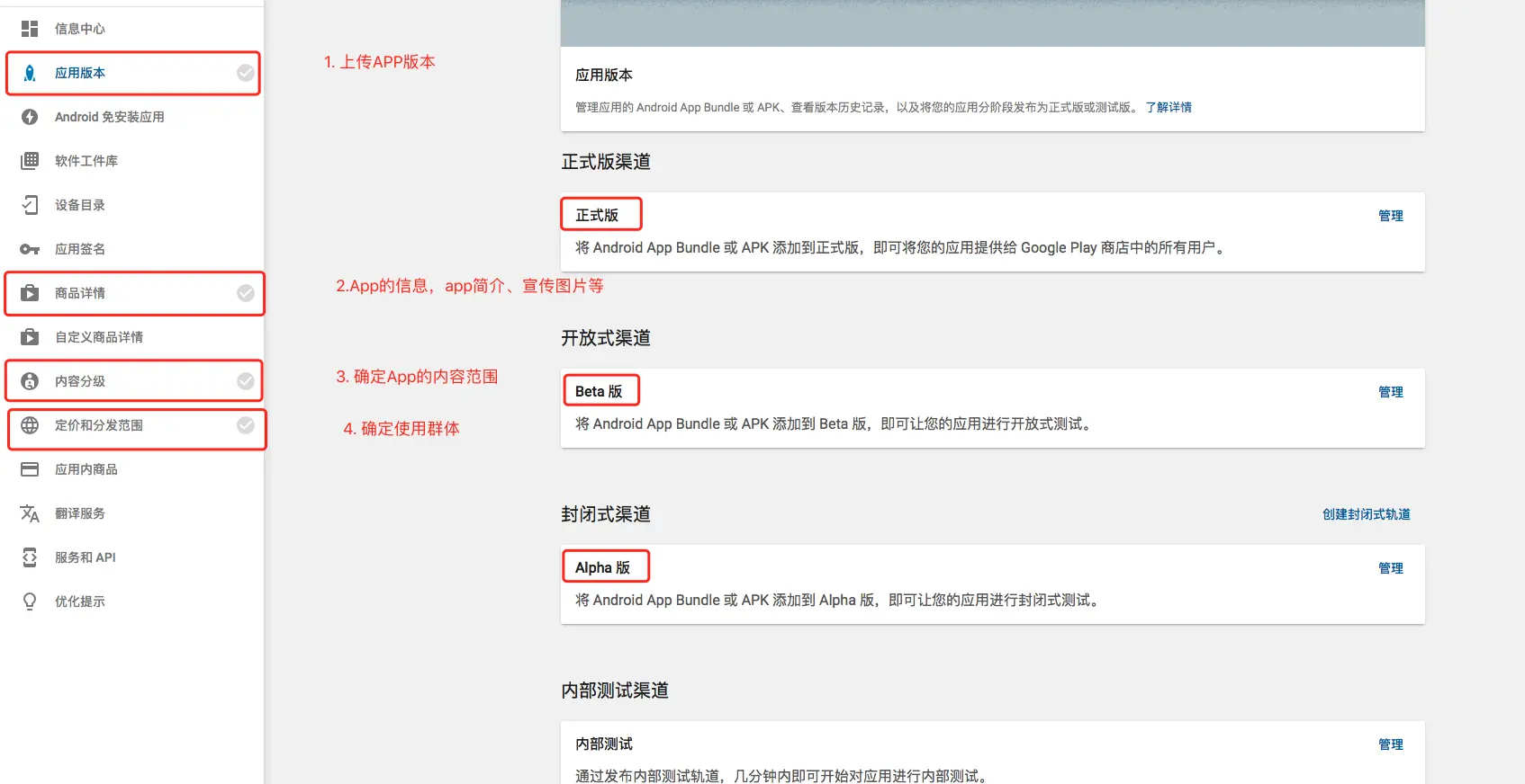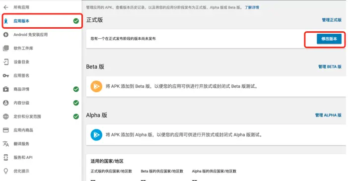 刚刚填写的资料都在商品详情栏目里,如果有需要修改的,还可以到此模块继续修改,之后要做的是Apk上传,点击应用版本,里面分为三种 正式报、Beta版、Alpha版,正式的App建议在内测阶段先上传Alpha和Beta版本