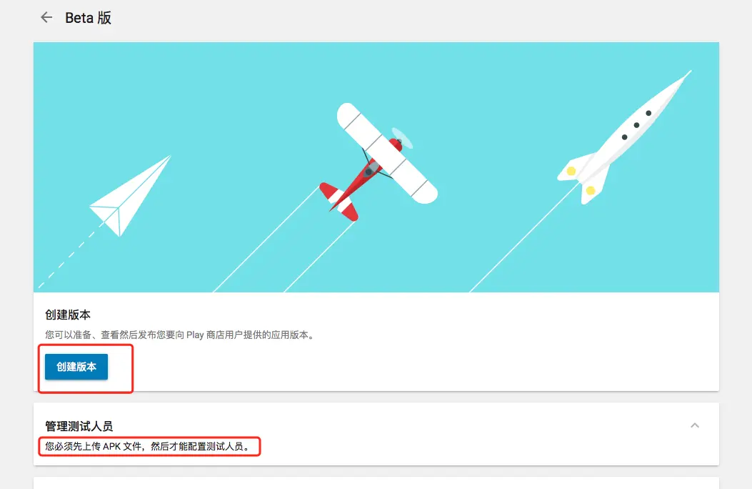我先创建的是Beta版,点击管理,进入Beta版界面,然后创建版本
