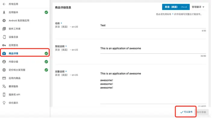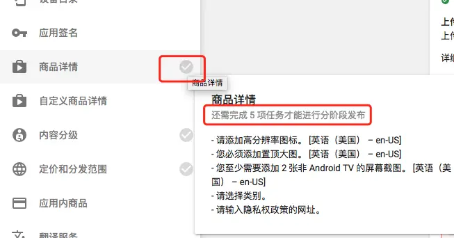 内容分析需要Apk上传成功才可以填写,其实就是一些问卷调查,按照流程走即可,没有什么坑,当执行完上面说的四个步骤,对应的那四个模块都会打绿色的钩,只有四个都变绿色了,点击商品详情才会出现可以发布字样,如果有未变绿的,把鼠标放到灰色钩上,会提示,什么信息未补全,按照提示操作即可