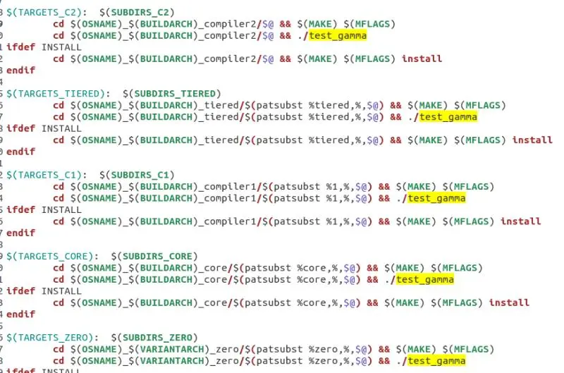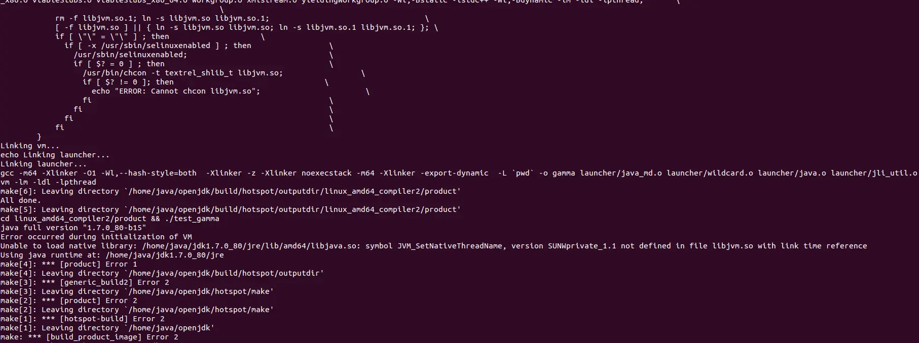 首先按照书上步骤是进入编译输出目录,./build/j2sdk-image中,说里面有一个gamma的运行文件,恕我眼拙,找了半天只看到了test_gamma,这是什么鬼?阉割版?好吧,按照书上继续来,进行env.sh的配置,但我发现env.sh里面已经配置好了,emmmmm...........好智能,下一步把,运行./test_gamma -version,发现报错了,果然是阉割版靠不住。经过一番百度和google之后发现,原来还要编译HotSpot,好吧,看来我对书上讲的还不是特别理解。