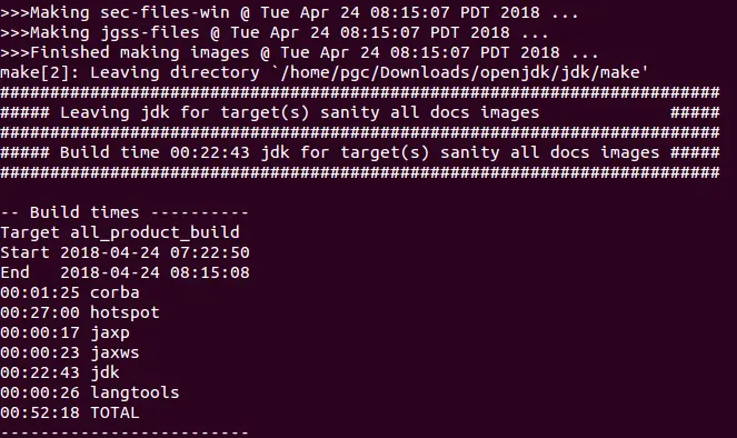 以上的问题应该还不是编译openjdk所有的坑,可能有些问题我还没有遇到,但这些坑就已经让我搞了三天的时间才搞定,如果遇到其他比较奇葩的坑,那只能自行baidu和Google了,最终顺利的话静静等待10分钟左右(依每人各电脑性能不同,时间可能不一样)的漫长等待,最终就编译好了,编译完成后会打印一下信息。