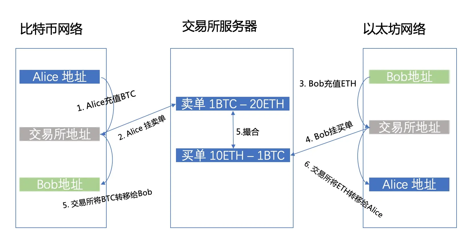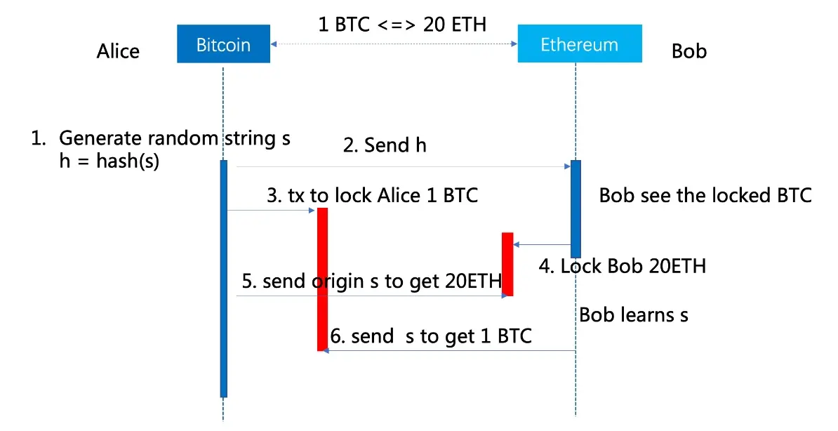 至此完成了Alice和Bob的BTC和ETH的交换(案例中省去了交易所的服务费)。通过该例子可以看出交易所的方式目前仅能够支持资产的交换,且资产交换的原子性、安全性完全由中心化的交易所保障存在较大的中心化风险。