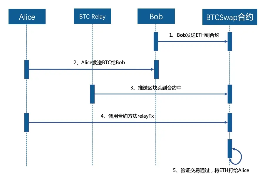 - BTCSwap合约结合tx和BTC链的区块链进行SPV验证,验证通过则将20ETH转给Alice以太坊地址。
