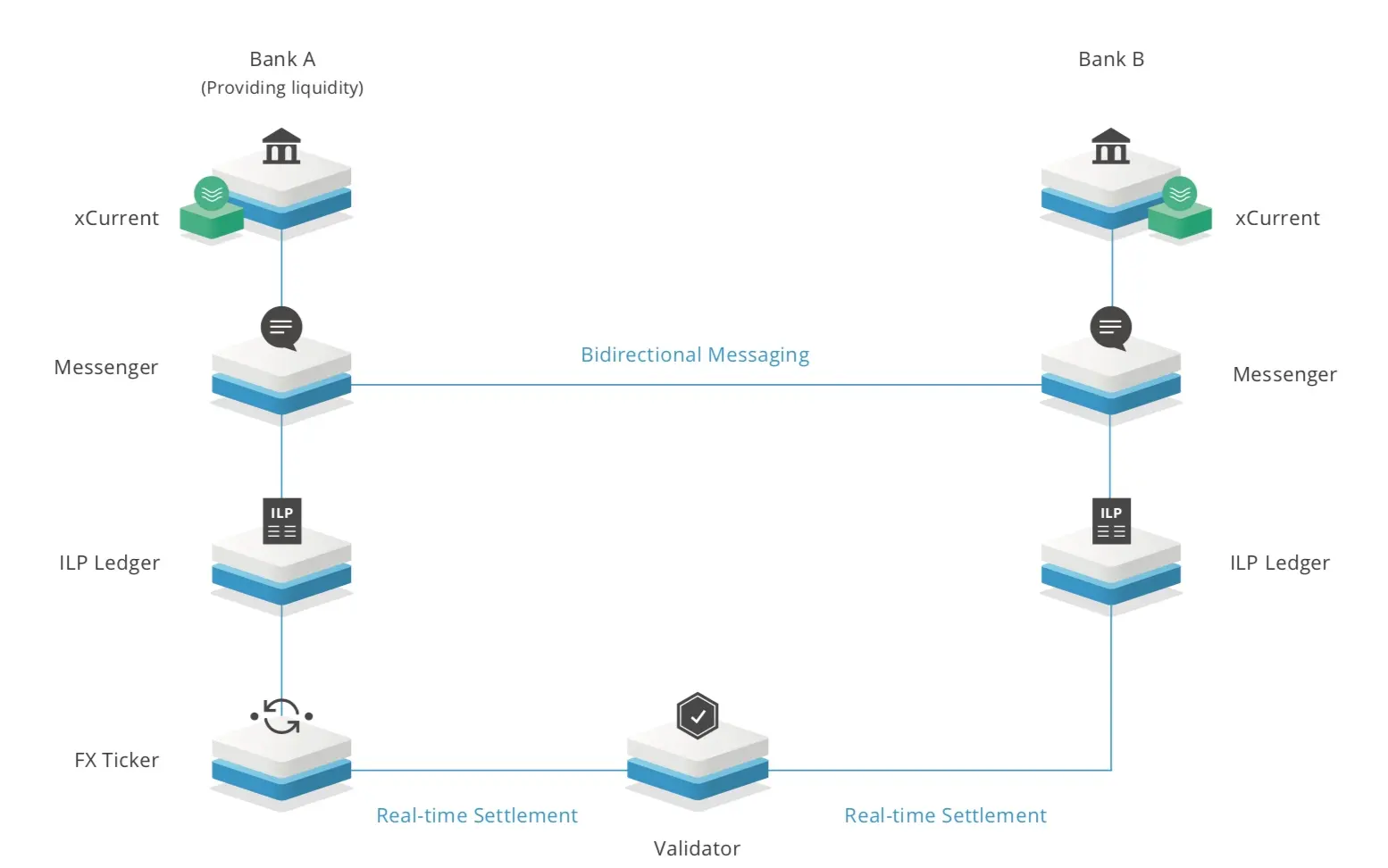 除此之外还有一种著名的分布式账本技术Ripple,也是采用类似公证人的机制来解决全球金融机构之间的资产交换。Ripple的系统架构如上图所示,Ripple系统中交易通过网络中的验证者进行交易的验证,验证者验证的交易通过加密算法保护交易内容不能被验证着窥探从而保证交易的隐私性。