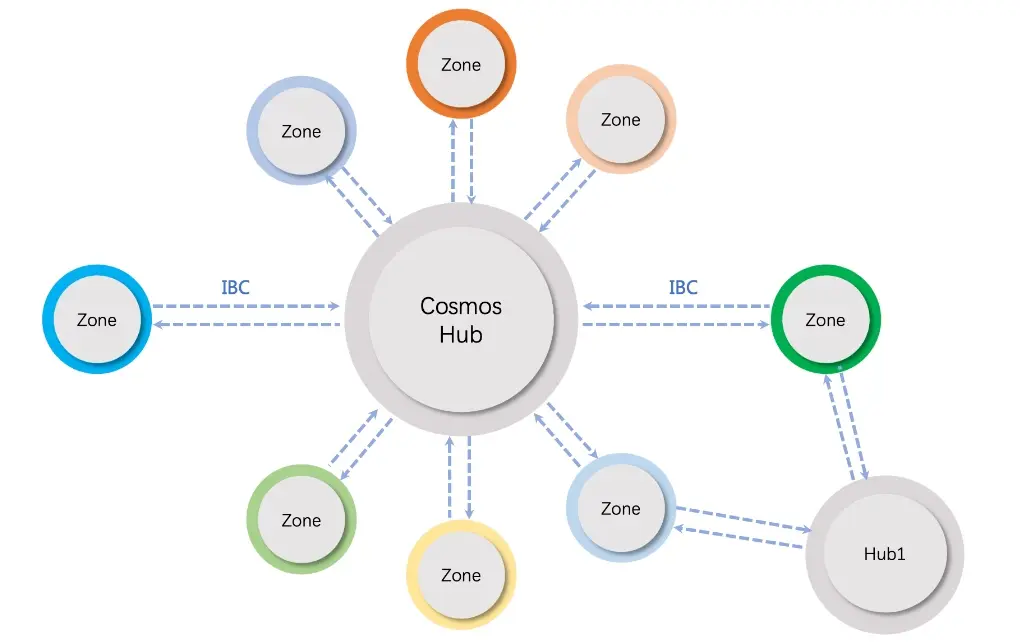 Cosmos网络是一个多链混合的区块链网格结构,如下图所示,该网络中主要包括两种角色: Hub: 用于处理跨链交互的中继链; Zone: Cosmos中的平行链, Cosmos中平行链需要具备两个前提条件: 1. 快速确定性(fast finality), 这个特性由共识算法保障,也就是说Cosmos的跨链不直接支持PoW等概率确定模型的区块链; 2. 强监管性(Sovereignty):每个平行链都具有一组验证者能够决定其出块。