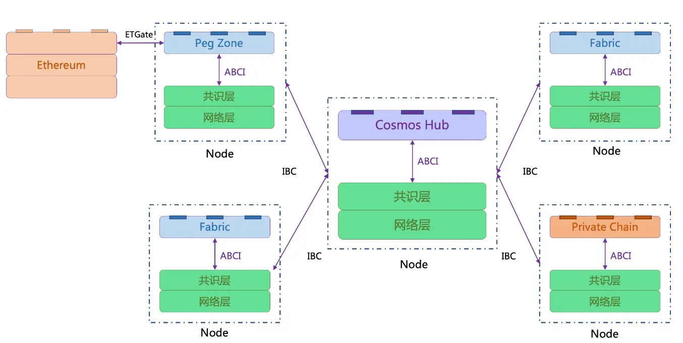 如下图所示是Cosmos 网络的详细架构图,Cosmos为方便平行链开发提供了基本服务CosmosSDK包括:共识、网络以及IBC协议等,这样基于Cosmos SDK开发的子链之间都能够方便地互相交互。此外对于非Cosmos SDK 开发的区块链需要使用Peg Zone进行桥接,如图中的Ethereum。