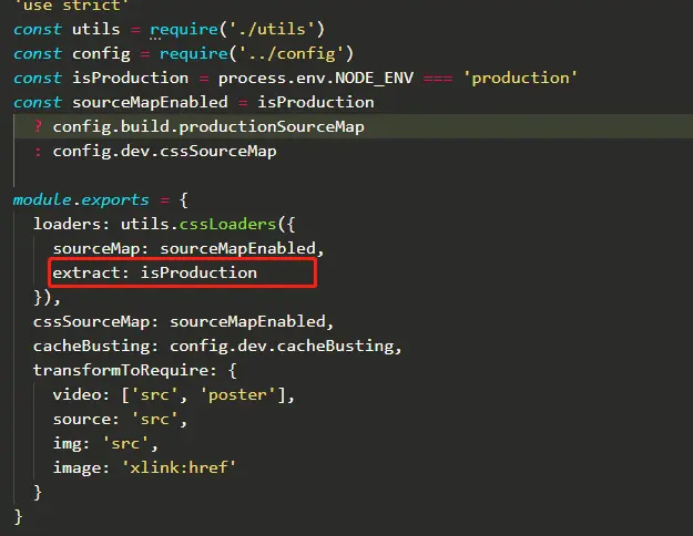 因为之前小白曾使用seajs+underscore + jquery搭建过一套组件结构,知道在IE9-下css选择器数量、文件大小以及style、link标签引入数量不能超过32个,所以比较轻松可以定位到问题,现在关键的问题是如何修改,在熟悉过vue-cli脚手架之后,发现在build/vue-loader.conf.js中有一段导出配置,代码如下