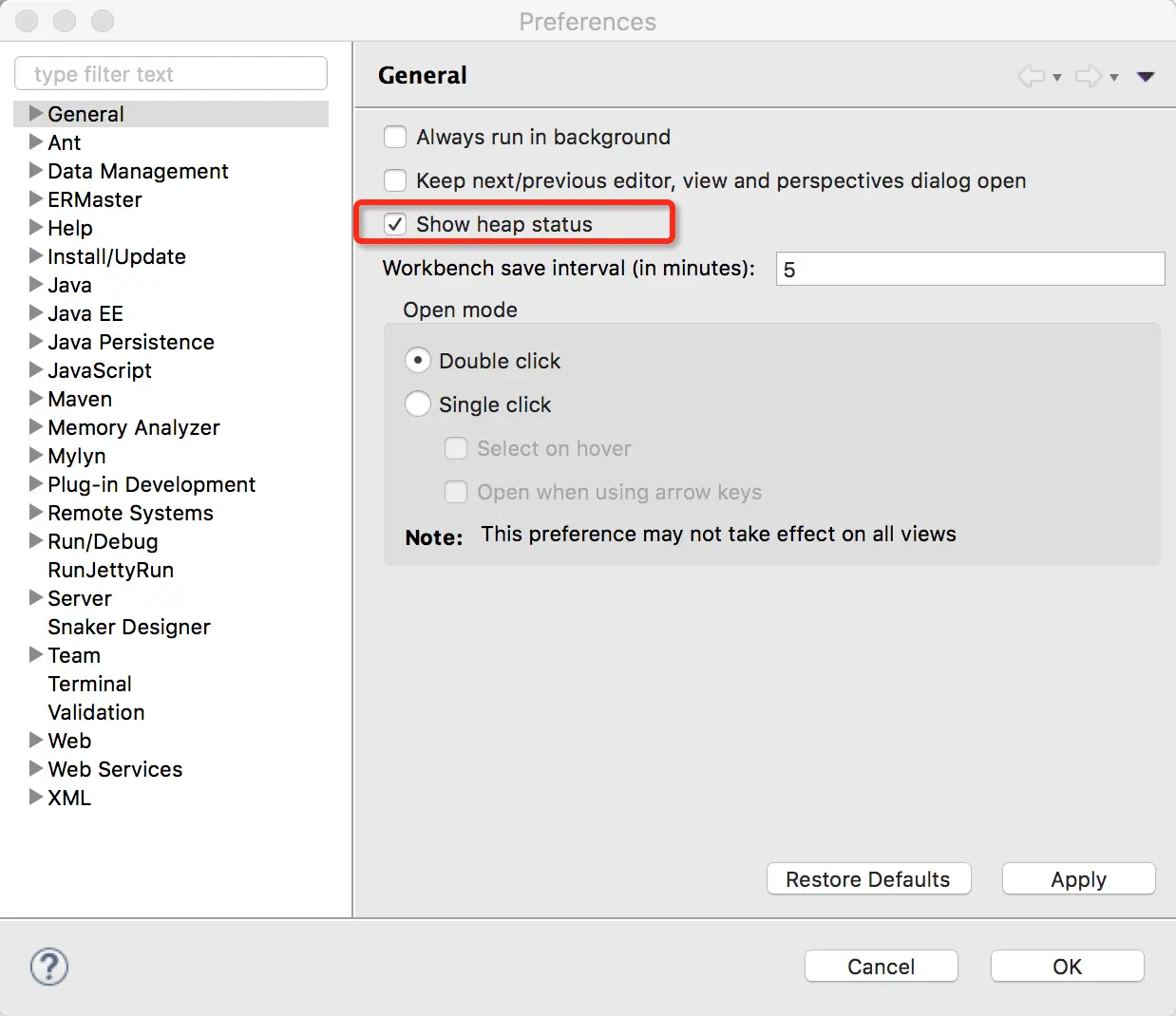 2.配置JVM 通过jvm参数--XX:-HeapDumpOnOutOfMemoryError可以让JVM在出现内存溢出是Dump出当前的内存转储快照; 我的配置是:-Xms20m -Xmx20m -XX:+HeapDumpOnOutOfMemoryError 附加:动态看见eclipse运行内存