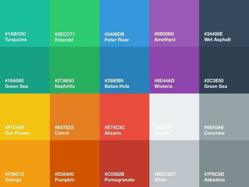 这个色表提供20种颜色(其实是10种,每种颜色有深和浅两个色调),对于简单的网页,基本够用了。实际效果可以参考 Flat UI 官网。