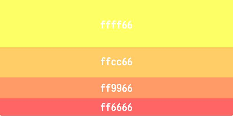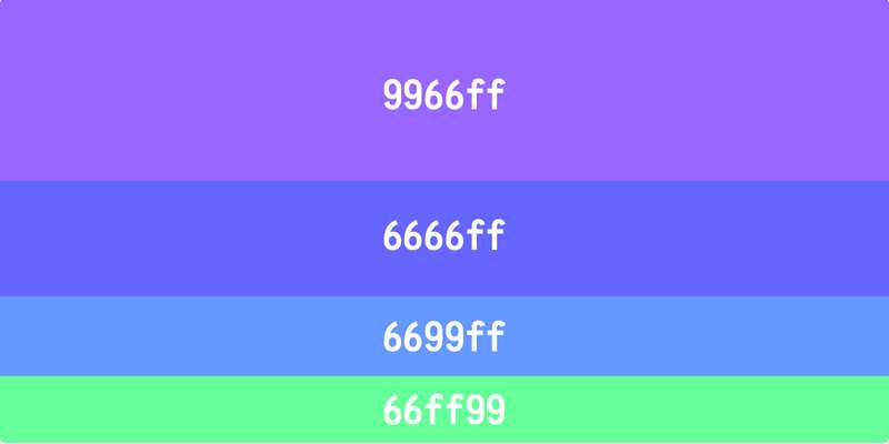 深颜色使用c、f、6、9这四个字符,组合生成 RGB 色值,比如紫罗兰色是9966ff,靛蓝是6666ff,红色是ff6666。