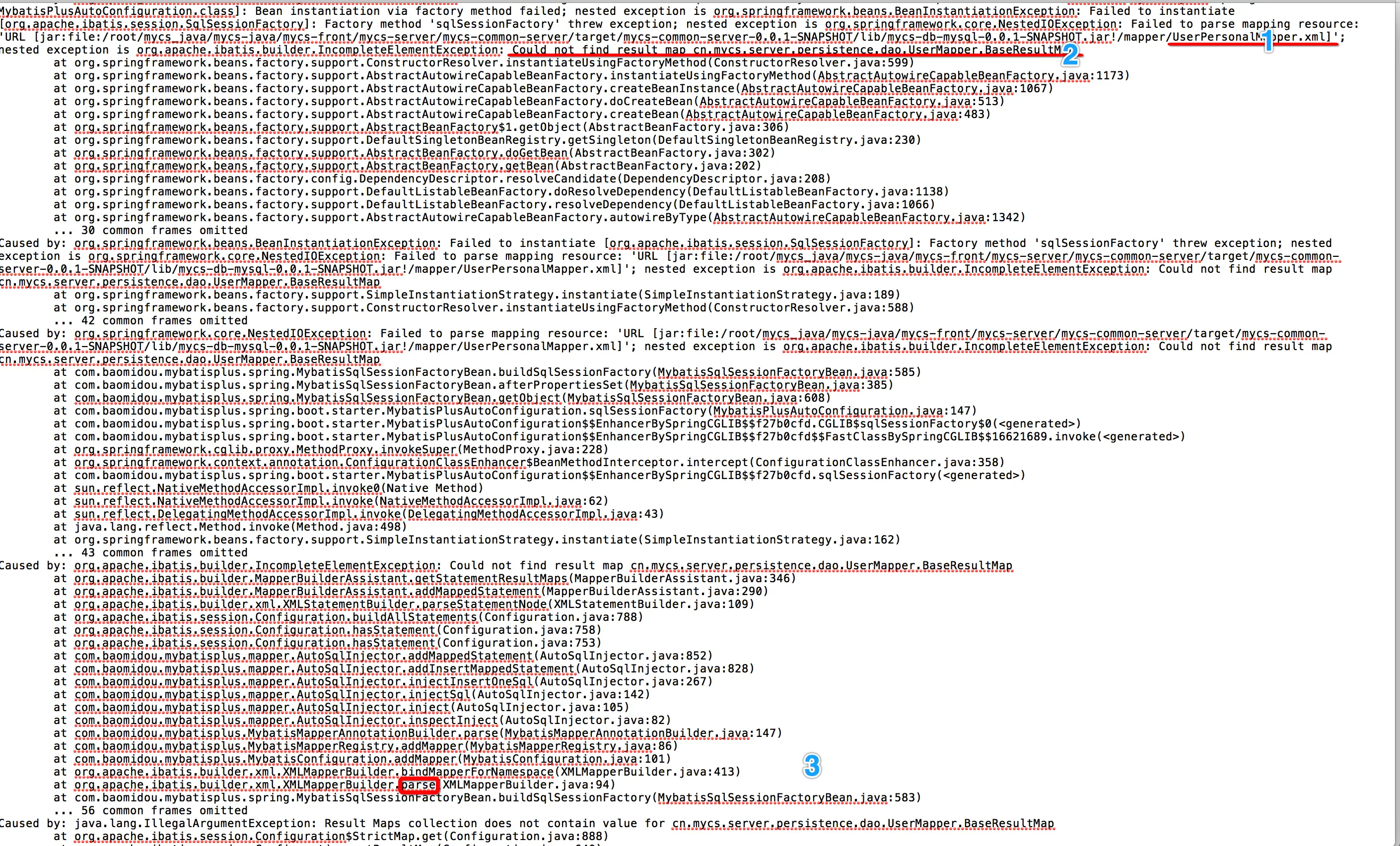 从我标记的三个重点加上小学简单的英文就可以看出,在解析UserPersonalMapper.xml时,没有找到BaseResultMap.另外一点,从我标记中的重点中也可以看出,这个BaseResultMap是在另外一个XML,也就是UserMapper.xml中声明的.