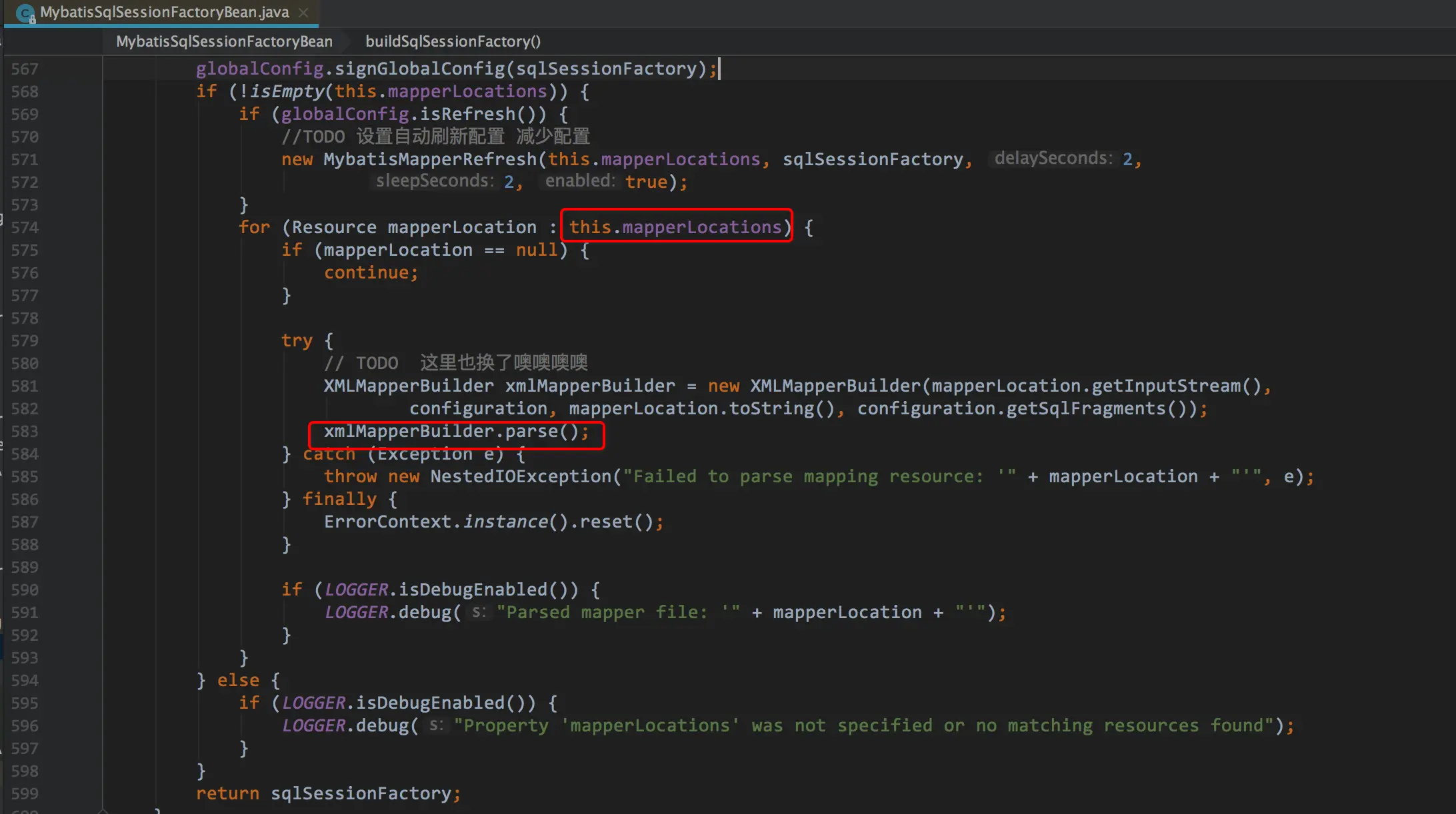 日志告诉我们是583行的时候报错的(图中已圈),然后mapperLocations也很明显,就是我们配置我mapper集合,他就是从这里集合中遍历出每一个mapper来进行解析的.