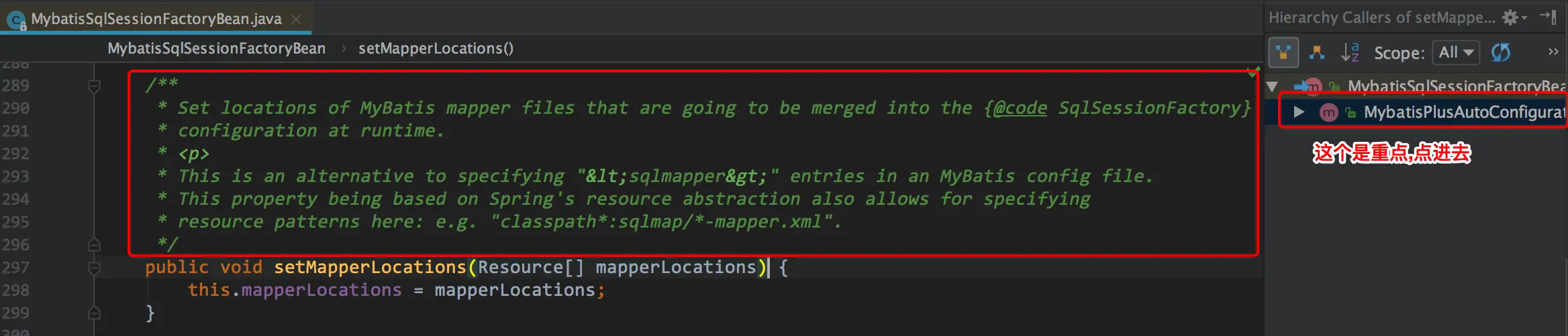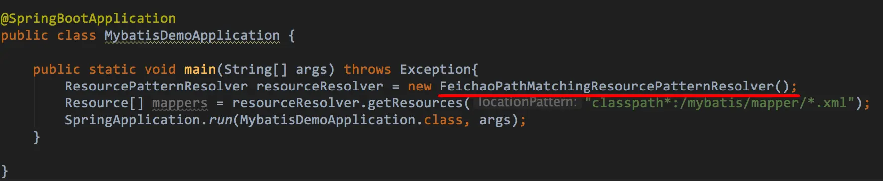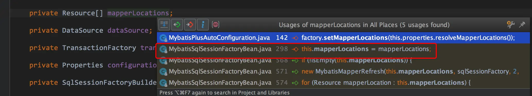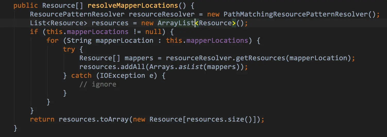 从resolveMapperLocations和PathMatchingResourcePatternResolver这两个类名和返回值Resource[],哪怕是把单词拆开一个一个翻译都大概能猜出,这个是根据配置的/*.xml这种配置,找到所有的xml资源.Resource[]是数组,数组是有序的,所以这个数组中的元素(mapper)顺序的顺序,就能决定我们前面的猜想是不是正确的.