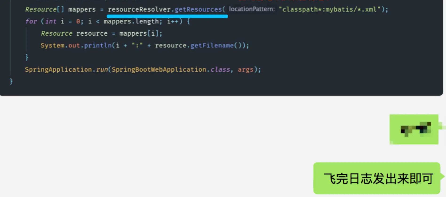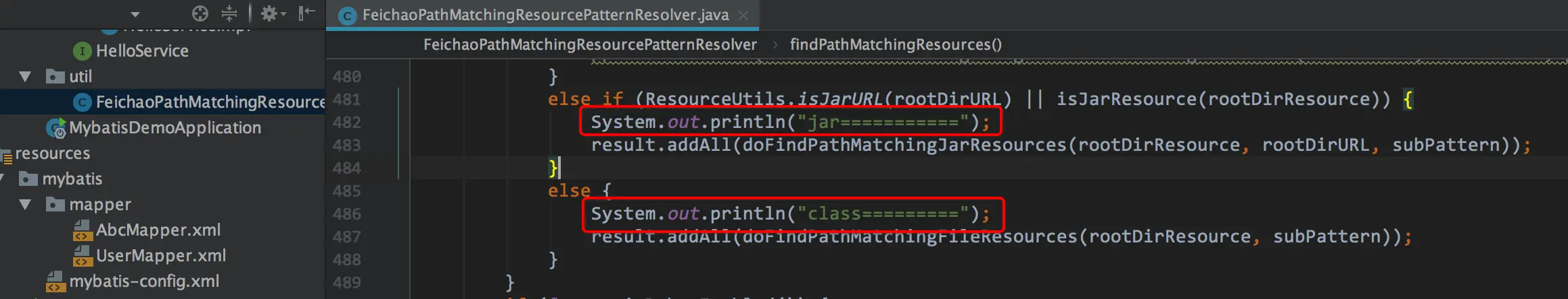 如果不幸错过了最好的关注时机,我再给你一个猥琐的办法.你把PathMatchingResourcePatternResolver这个类拷贝出来,改个名字.比如FeichaoPathMatchingResourcePatternResolver.然后打上一些简陋的日志信息,如下图