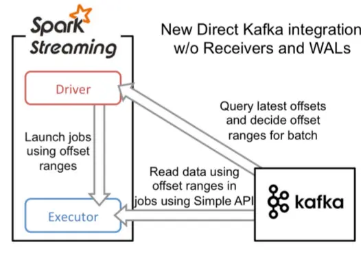 在spark1.3之后,引入了Direct方式。不同于Receiver的方式,Direct方式没有receiver这一层,其会周期性的获取Kafka中每个topic的每个partition中的最新offsets,之后根据设定的maxRatePerPartition来处理每个batch。其形式如下图: