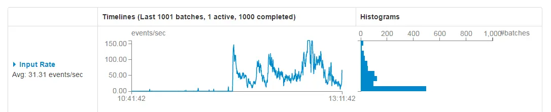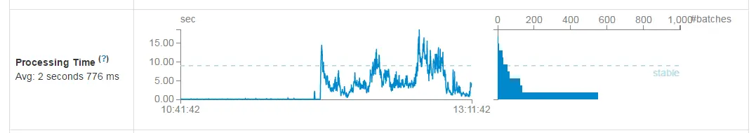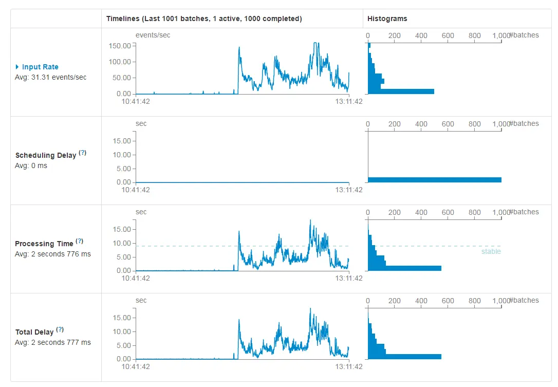 当然不同的应用场景会有不同的图形,这是本文词频统计优化稳定后的监控图,我们可以看到Processing Time这一柱形图中有一Stable的虚线,而大多数Batch都能够在这一虚线下处理完毕,说明整体Spark Streaming是运行稳定的。