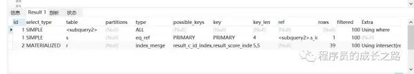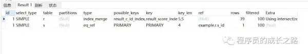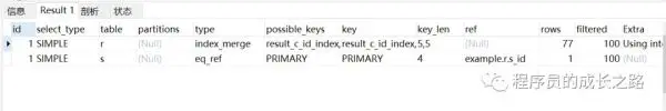 这里用到了 intersect 并集操作,即两个索引同时检索的结果再求并集,再看字段 score 和 c_id 的区分度,但从一个字段看,区分度都不是很大,从 Result 表检索,c_id = 81 检索的结果是 81 ,score = 84 的结果是 84 。
