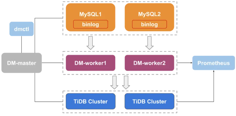 通过上面的 DM 架构图,我们可以看出,除上下游数据库及 Prometheus 监控组件外,DM 自身有 DM-master、DM-worker 及 dmctl 这 3 个组件。其中,DM-master 负责管理和调度数据同步任务的各项操作,DM-worker 负责执行具体的数据同步任务,dmctl 提供用于管理 DM 集群与数据同步任务的各项命令。