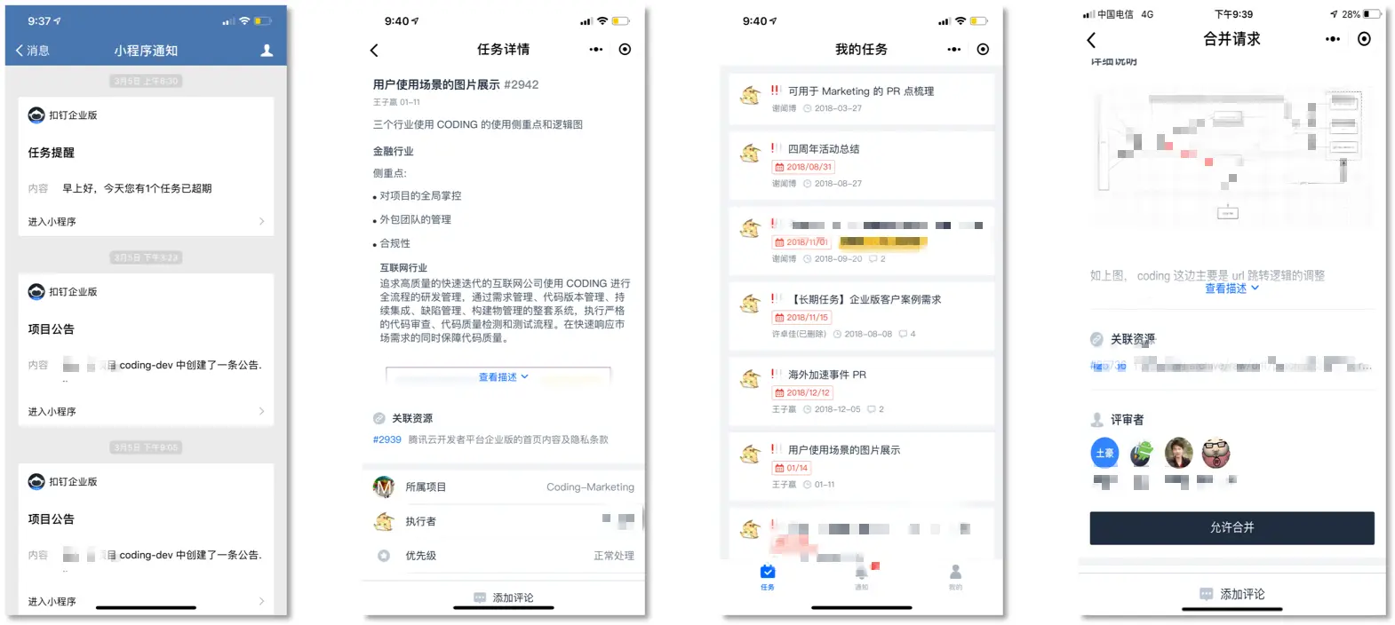 同时通过 CODING 的企业微信/微信小程序,还能实现随时随地同步与协同任务,小程序可以直接查看任务详情、评论任务,还能实现代码合并(MR)等功能,真正做到 Coding Anytime Anywhere。