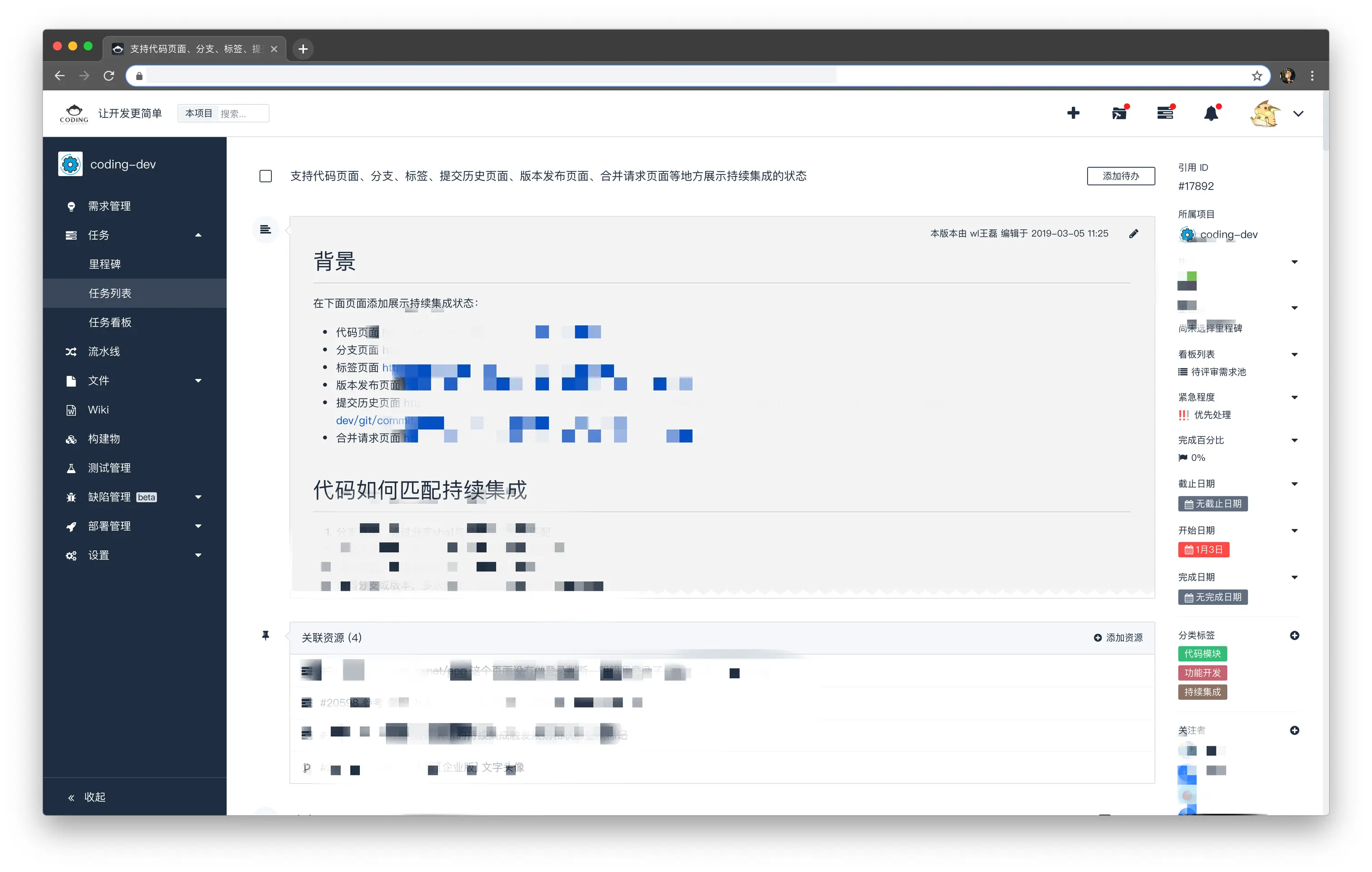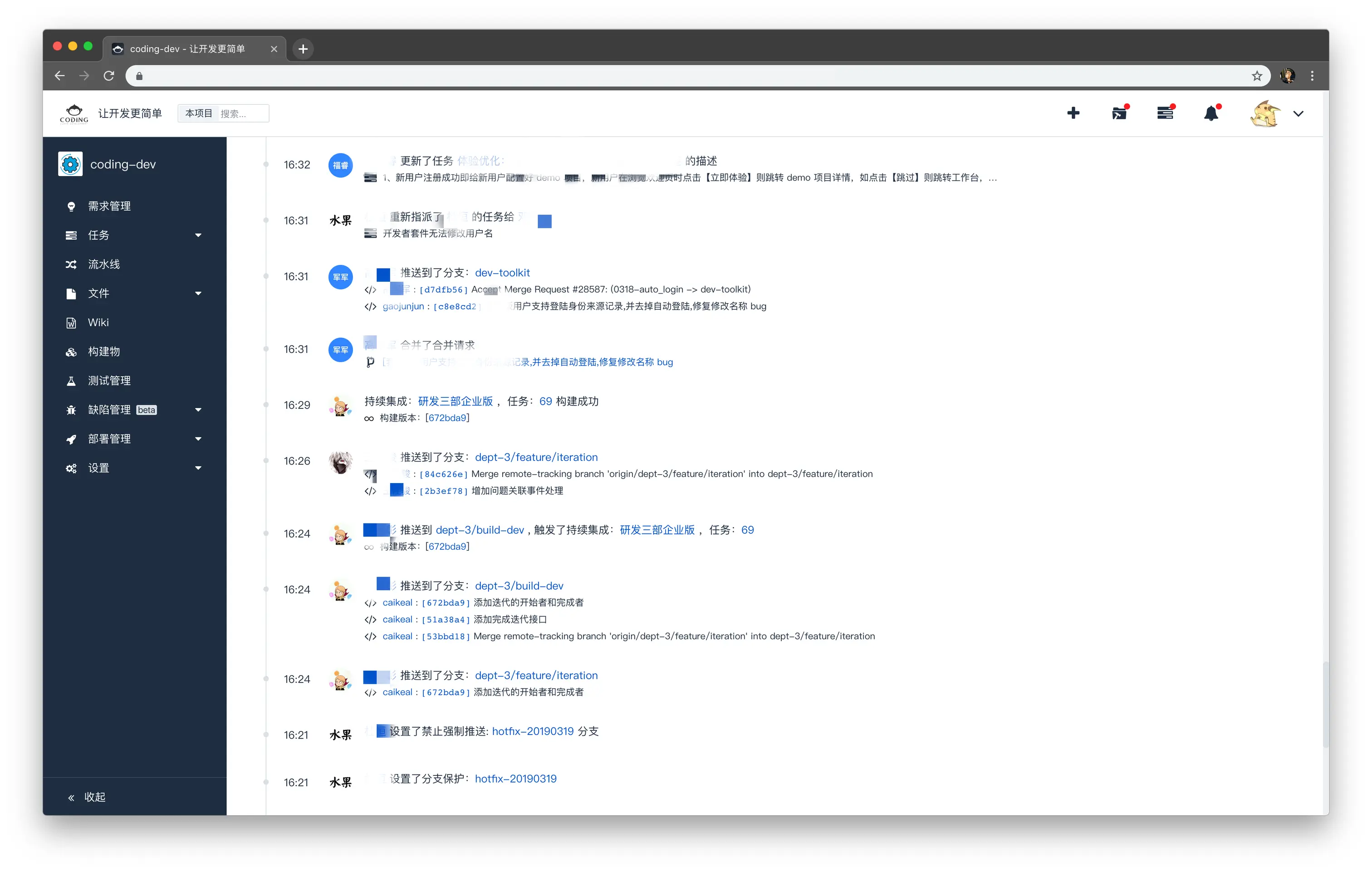 CODING 研发部门的工作流都是在项目内进行:我们使用任务功能来管理需求,使用文件来保存产品原型,使用代码功能进行开发,使用持续集成来进行自动化测试,使用缺陷管理来收集反馈,同时还使用 wiki 模块对知识进行储存与共享。通过在任务中添加关注者的方式来方便相关同事随时 follow 和 review 任务动态。