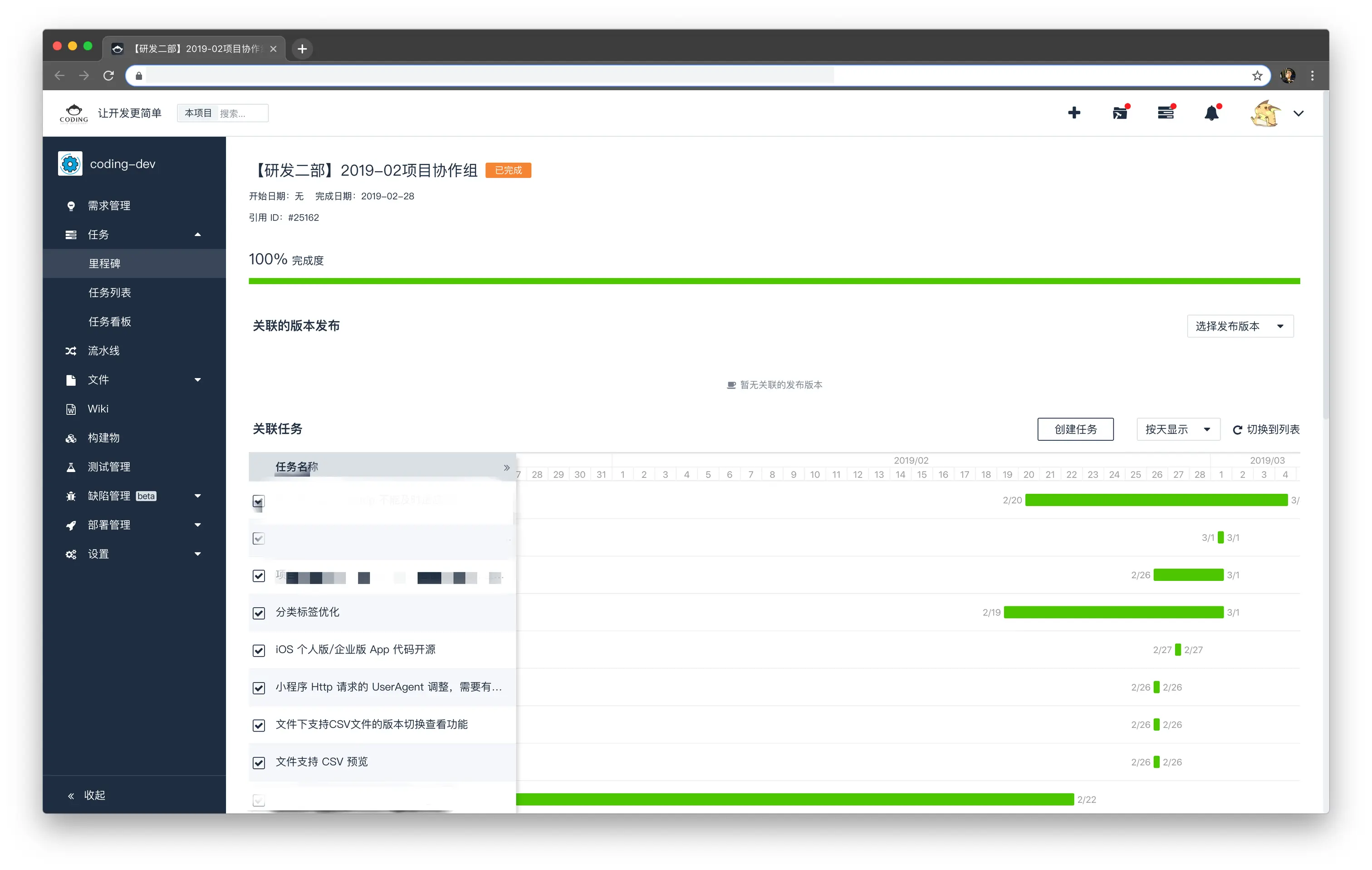 CODING 强大的任务系统支持标签、跨项目引用、版本控制等多项功能,并会实时记录用户的每一次操作。同时 CODING 需求管理功能也即将上线,将在任务系统之外为用户提供更细分更场景化的使用方式。