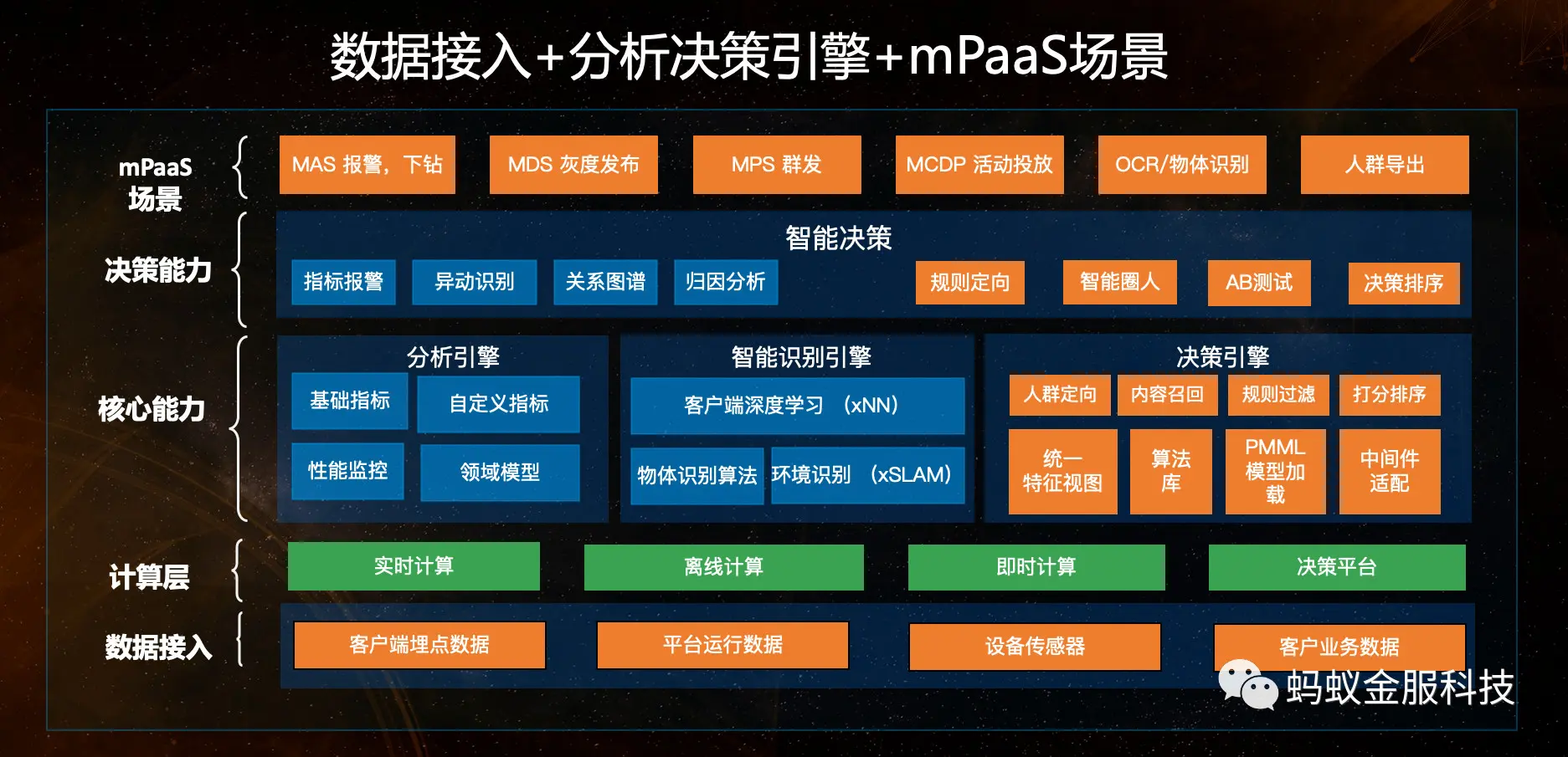 关于智能化平台,mPaaS 主要着力点在于构建了“数据接入+分析决策引擎+mPaaS场景”的一体化移动 AI 方案。蚂蚁金服内部最核心的 AI 技术,同时是内部构建“千人千面”所应用的技术,被剥离出来形成了决策引擎。在“运营”和“体验”两个方向下,结合 mPaaS 完善的业务应用场景,输出移动分析、智能投放、智能预测、OCR 识别等一体化垂直解决方案,让用户能够真正享受到可落地应用的人工智能服务。
