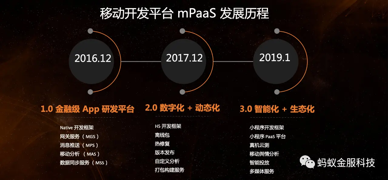 随着时间推移,金融机构对用户有了更深刻的理解,同时对技术提出了更高的要求。为了更有效地利用数据,提高运营的 ROI,App 需要向智能化方向发展。另外,小程序作为 2018 年技术圈的热点,同样引起了金融行业的重视,金融公司普遍选择小程序作为抢占市场的利器。因此,蚂蚁金服将小程序框架抽离出来,进行产品化输出,金融机构可以基于此构建自己的 App 生态。