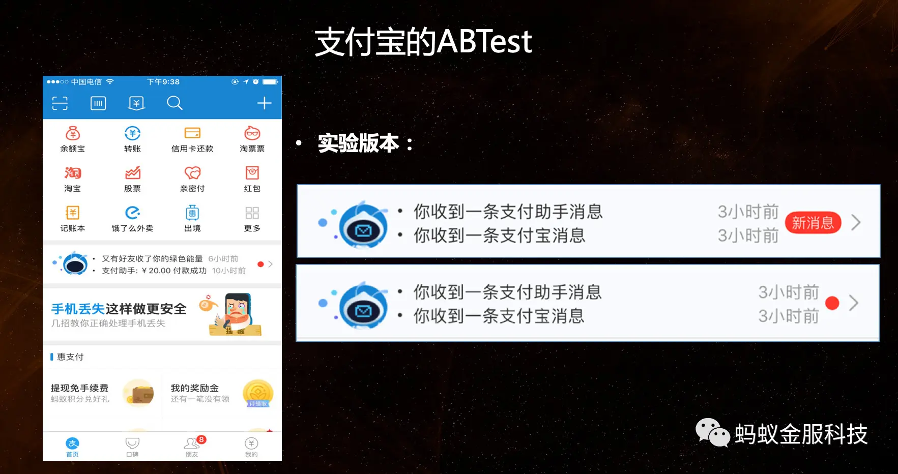 通过 ABTest,我们可以知道用户喜欢什么、不喜欢什么,从而为 App 的体验优化提供更多数据支持。如图所示,支付宝面向不同用户提供不同的界面样式,从而帮助产品团队更直接地找到最优的交互方案。