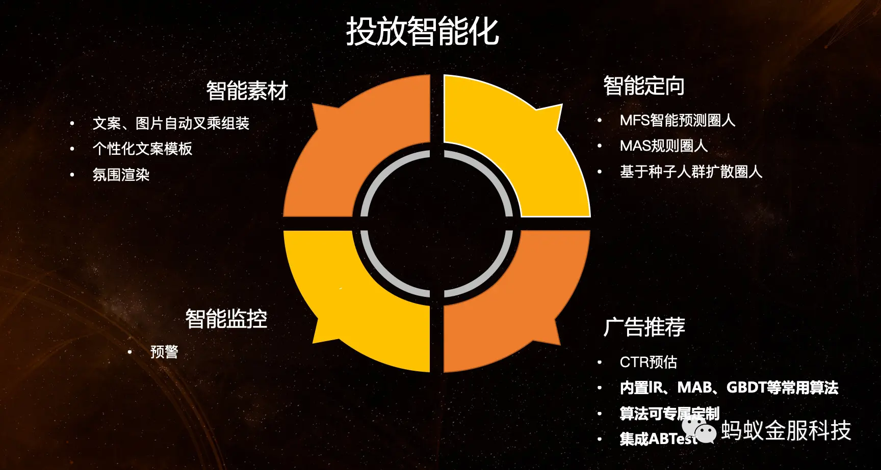 智能投放产品能够按照用户属性、实际需求真正做到千人千面,针对性地投放广告。智能素材、智能圈人、智能推荐以及智能监控是目前支付宝内成熟应用的智能化模块: