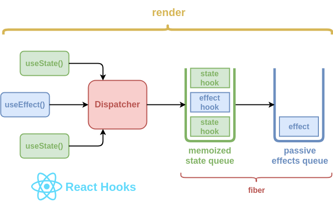 一旦更新完成,一个名为 [finishHooks()](https://github.com/facebook/react/tree/5f06576f51ece88d846d01abd2ddd575827c6127/react-reconciler/src/ReactFiberHooks.js:148) 的函数将会被调用,在这个函数中,hook 队列中第一个节点的引用将会被保存在已渲染 fiber 的 memoizedState 属性中。这就意味着,hook 队列和它的状态可以在外部定位到。
