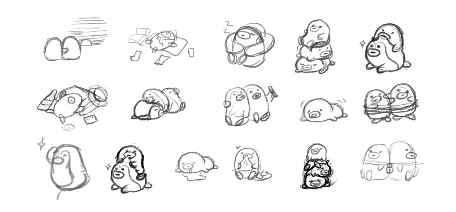 在最后的插图完成之前我们绘制了很多概念草图。每个概念都是在保持PUPU圆形身体的同时绘制的。彩色色调仅限于保持图形色调的一致性,即使使用粗粗的笔触,也对图形应用了简单的元素。