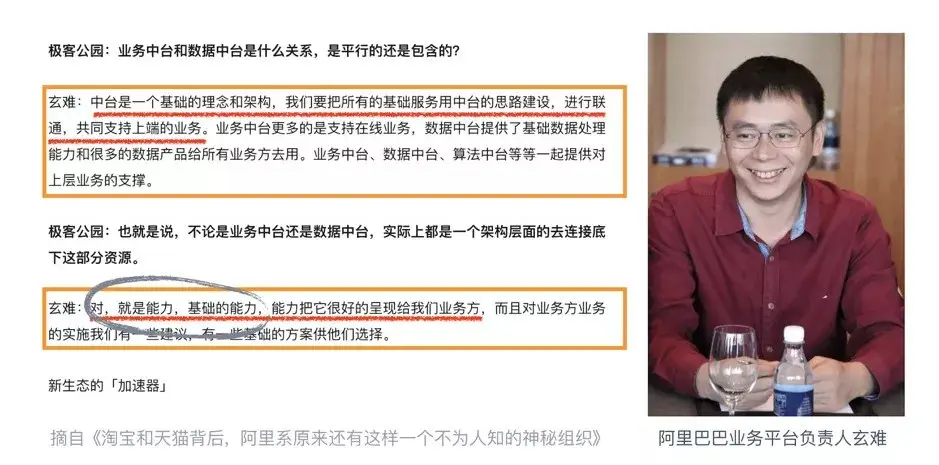 本文中我们一直提到的一个词就是“能力”,从玄难的这段采访也可以看出,在阿里“能力”也是中台的核心。