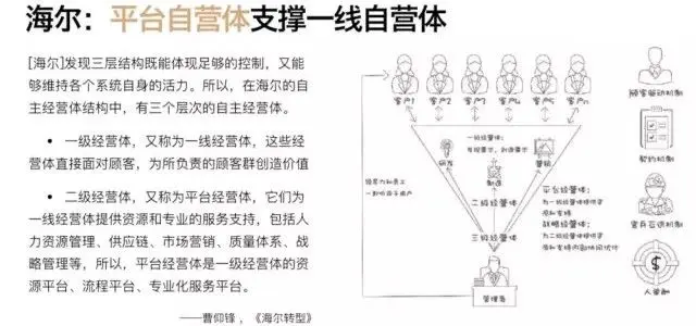 海尔也早在⼗年前就已经开始推进平台化组织的转型,提出了“平台⾃营体⽀撑⼀线⾃营体”的战略规划和转型⽬标。构建了“⼈单合一”、“⽤户付薪”的创客文化,真正将平台化提⾼到了组织的⾼度。